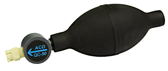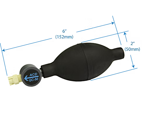 The QC-50 is a simple yet rugged device allowing quick and easy testing of gas detection systems. The QC-50 uses ACD's QuickCheck Vial (QCV) technology. These QCV factory sealed vials contain a small amount of the chemical to be tested in an inner glass ampoule. For use, the QCV is firmly squeezed to break the inner ampoule before it is inserted into the QC-50. Then with a few squeezes of the aspirator bulb a reliable bump test gas is produced. The QCV contains such a small amount of chemical it is non-hazardous for shipping, storage and disposal. And since the vials are sealed they have a very long shelf life compared to many other bump test methods.